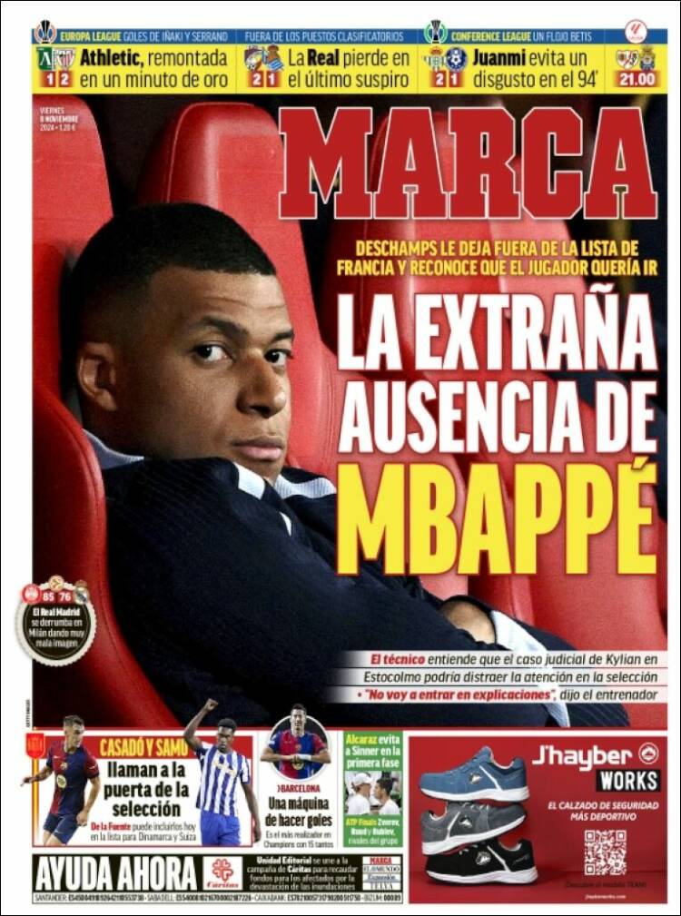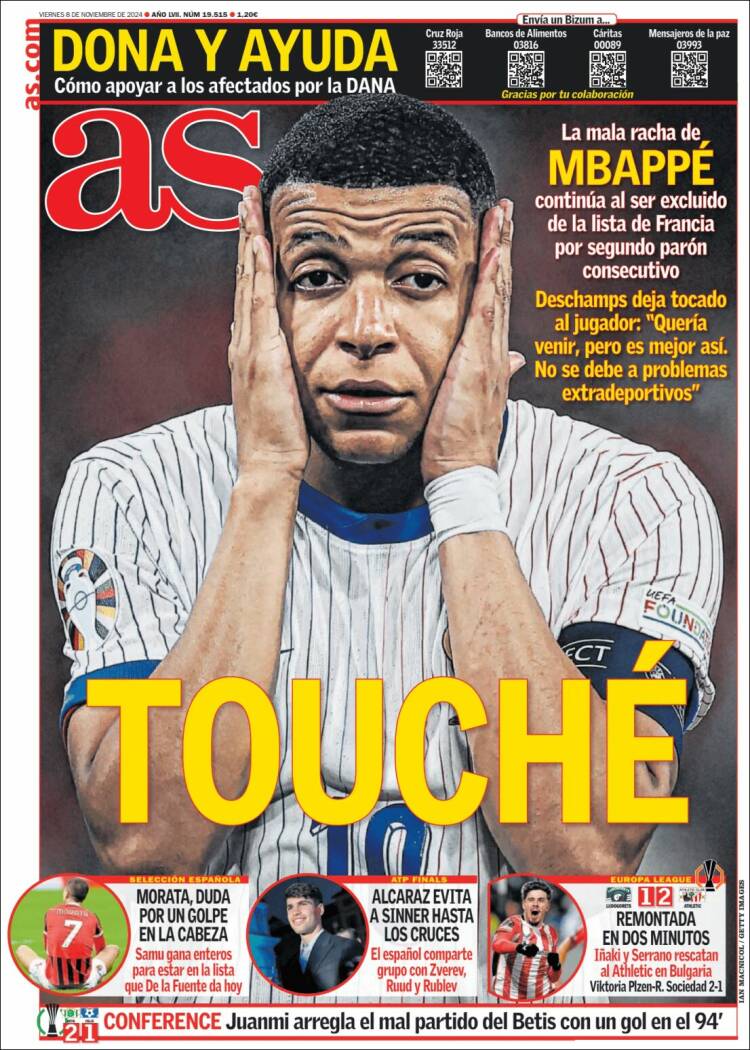 As muestra la misma perplejidad que Marca, y nos depara una primera plana con el careto frustrado de Kylian. Lo cierto es que no sabemos si Kylian está así de frustrado ante la noticia de que no va con su selección.