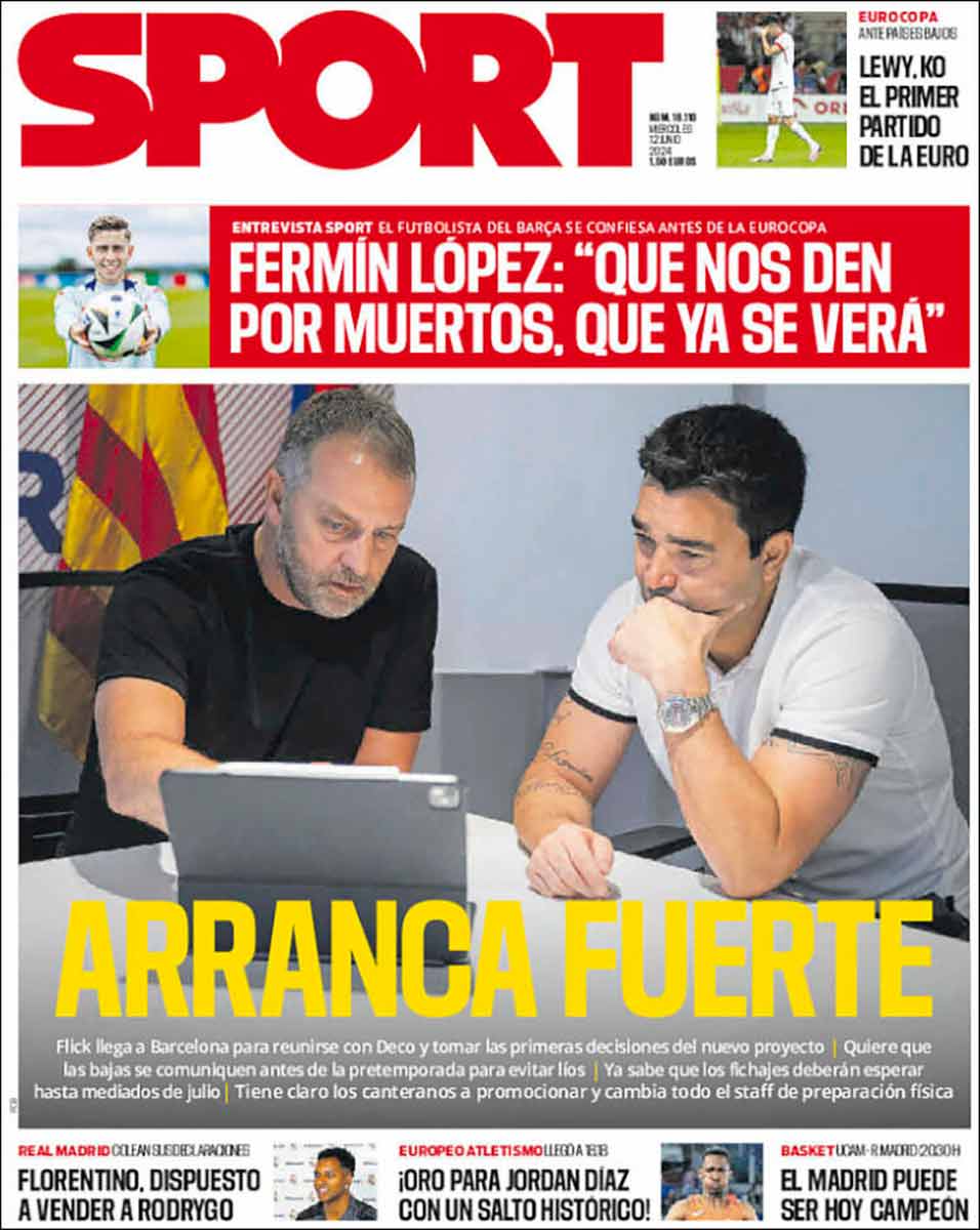 Sí, amigos, sí. El FC Barcelona tratará de devolver la música a las masas, después de décadas de abducción de éstas a manos de la ordinariez reggaetonera. Les deseamos toda la suerte en esta noble ambición, mientras a vosotros os recordamos (también lo hacen el resto de portadas del día) que la Eurocopa está a la vuelta de la esquina. Es un sucedáneo del verdadero fútbol, o sea del reggaetón, o sea del Madrid, en el cual elementos sueltos de la congregación de apóstoles se dispersan en aras de no sabemos qué cuestiones relativas al pasaporte. Cuestiones menores en todo caso, pero que no nos impedirán, de tanto amor como les tenemos, seguirlos incluso en esas peripecias desperdigadas, un poco como un beatlemaníaco que se interesa por los álbumes en solitario de los Fab Four.