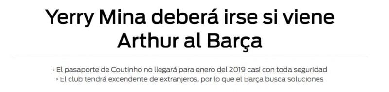Lo dice 'Sport', no nosotros. Al parecer, el pasaporte de Coutinho tardará casi un año en llegar, por lo que, entre eso y la más que posible llegada de Arthur, el club blaugrana tendría excedente de extranjeros. ¿Quién sobra? Uno de los últimos en llegar. Canto inolvidable a los valors y al tacto. Ya imaginamos a Bartomeu con las gafas de Men in Black convenciendo a los culés de que ese tal Yerry Mina jamás vistió la elástica blaugrana.