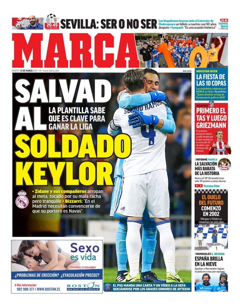 En Madrid, mientras tanto, 'Marca' nos cuenta que el vestuario arropa a Keylor Navas. Puede ser la noticia más importante del Siglo XXI y parte del XXII. ¡Un vestuario apoyando a uno de sus compañeros! ¿Qué va a ser lo siguiente? ¿Jugadores diciendo que creen en el entrenador? ¿Un presidente confiando en el proyecto? ¡Me tiemblan las manos al escribir!