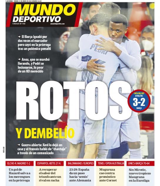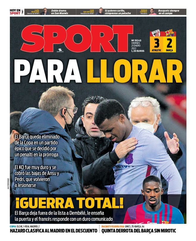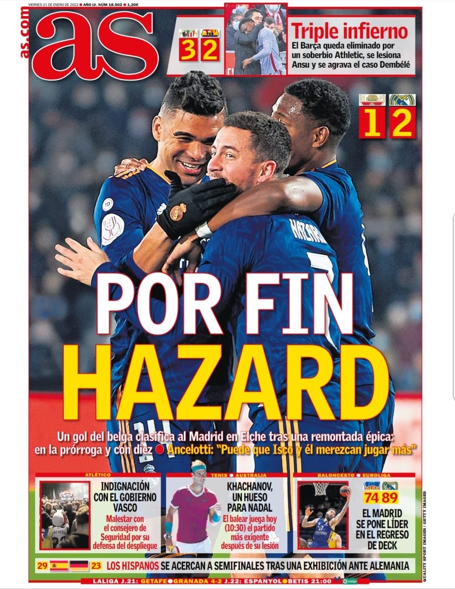 “Por fin Hazard”, titula As, y tampoco nos parece mal. Lo que nos parece peor es que no se haga mención alguna a la escabechina antimadridista perpetrada por Figueroa, y dudoso nos resulta el recuadro inferior en relación a los incidentes de seguridad acaecidos en San Sebastián con ocasión de la visita copera del Atleti. “Indignarse” como hace As con el mejorable despliegue policial del choque en Anoeta es legítimo y hasta necesario, pero uno ganaría muchos enteros en la causa si a esa indignación se añadiera alguna vez una similar por el auspicio que el propio Atleti lleva a cabo con un grupo ultra como el Frente Atlético, colectivo nazi con muertes a sus espaldas que no solo la entidad rojiblanca apoya manifiestamente, sino ante cuyos siniestros líderes rinden cuentas los mismísimos jugadores de Simeone. Es como lo de las barras bravas ochenteras que contaba Ruggeri pero en 2022.