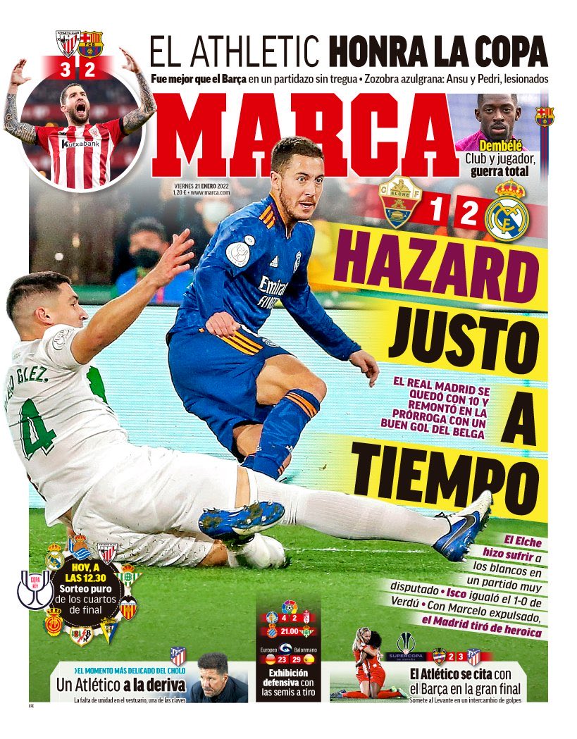 Buenos días. Paco Gento habría estado orgulloso. Se llevó a la eternidad (pero ¿no estaba ya en ella?, ¿no estamos todos en ella gracias a él?) el brillo de la Supercopa, y el mundo siguió girando tras su marcha con una victoria en la prórroga y con diez en partido copero frente al Elche. La prensa deportiva madrileña destaca a Hazard -también lo hace Jesús Bengoechea en su Man of the Match-, por cuanto hubo belleza en su resurrección inopinada, en su modo de emerger en la prórroga como si Fray Luis de León hubiera jugado en el Chelsea. Leed la crónica de Ramón Álvarez de Mon y la arbitral (ya llegaremos a esta ignominia después) de Alberto Cosín.