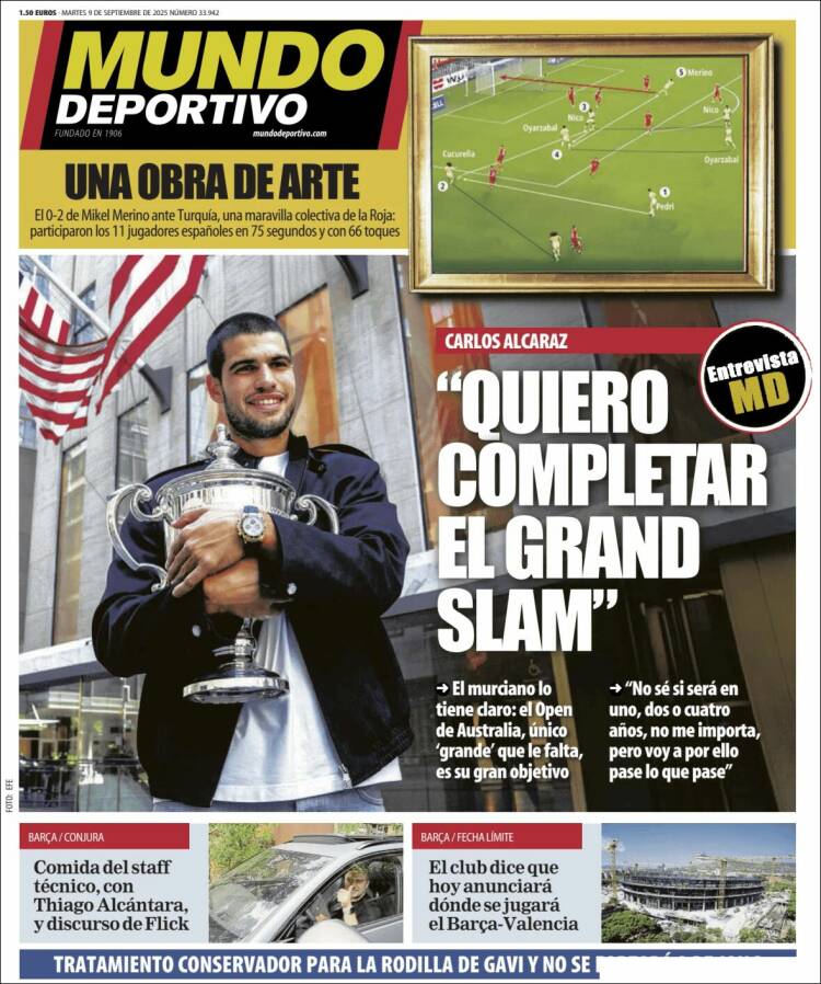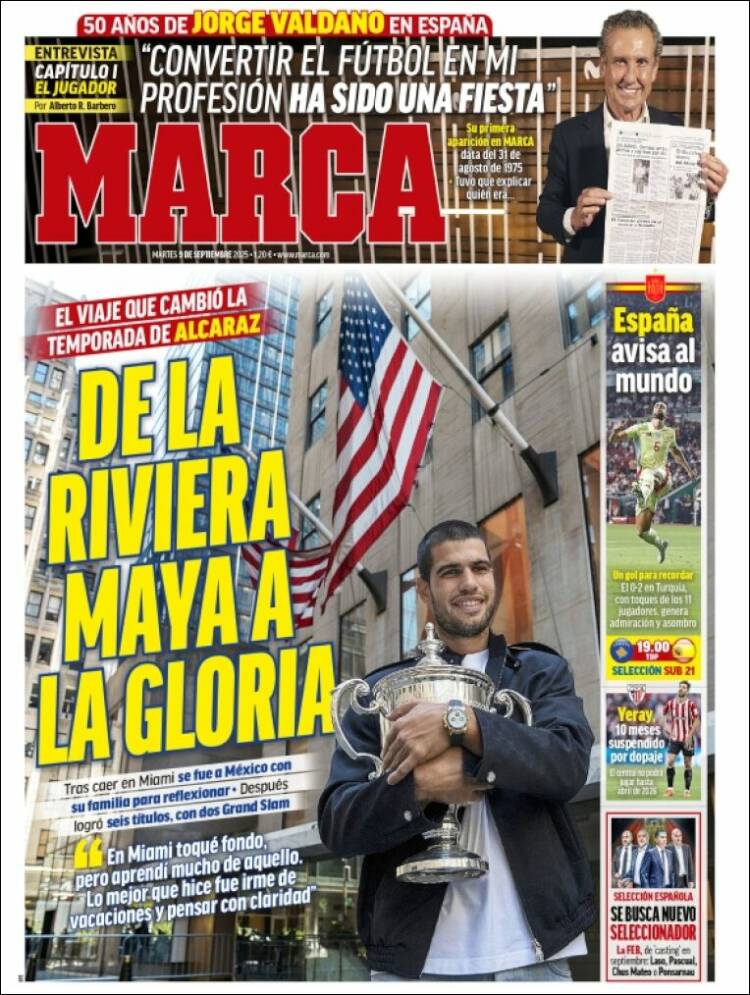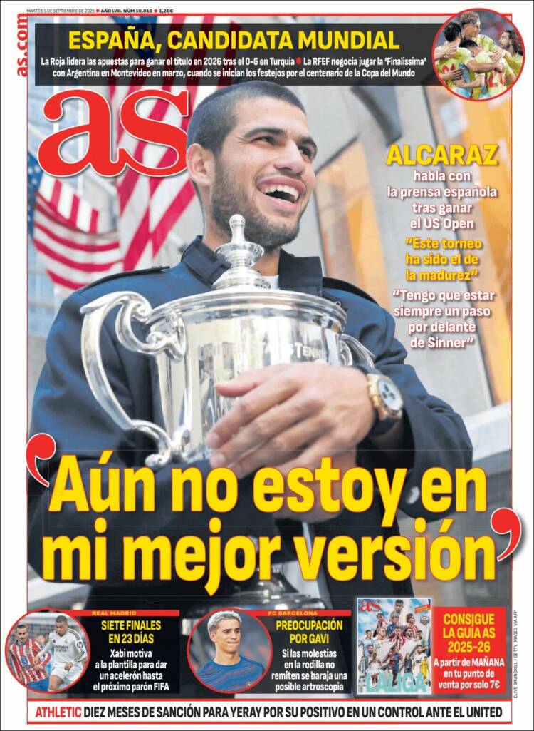As también ilustra su portada con Carlitos Alcaraz abrazado al trofeo ganado en el Abierto de Estados Unidos. Respecto al Madrid, el diario de PRISA destaca que se presentan siete finales en 23 días, y que Xabi motiva a la plantilla para dar un acelerón hasta el próximo parón FIFA. Los blancos, ya sabéis, deberán marcar cuatro o cinco goles más de los necesarios para ganar cada uno de esos partidos —y todos los de la temporada—, pues el sistema ha empezado especialmente motivado en su afán por destruir al club de Concha Espina.