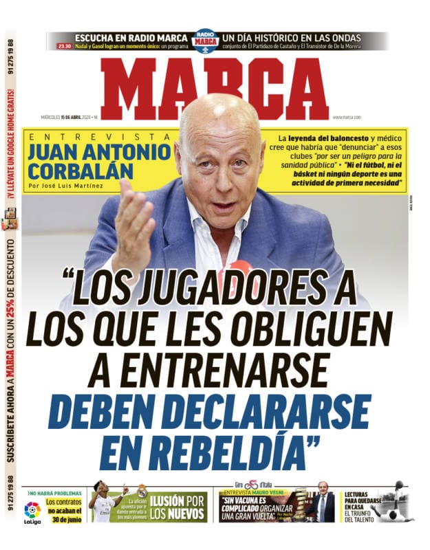 De hecho, hasta el próximo 24 de abril hay tiempo para que otras leyendas madridistas puedan sumarse a tan hermosa iniciativa solidaria. Bien podría ser Juan Antonio Corbalán, amigo galernauta, que aunque hoy se muestra belicoso en la primera plana de Marca sabemos que no le cabe el corazón en el pecho. Por algo es cardiólogo y sabe de lo que habla. Dice la portada del diario más leído de España que hay ilusión por los nuevos. Y por los no tan nuevos, añadimos ¿Por qué? Porque hoy, discúlpennos de nuevo la osadía, la portada somos nosotros y la subasta benéfica impulsada por La Galerna y la Fundación Real Madrid se sustenta en la magia de mitos como Rafael Martín Vázquez, Álvaro Benito, Álvaro Arbeloa, Juanma López Iturriaga…. Y tantos otros.