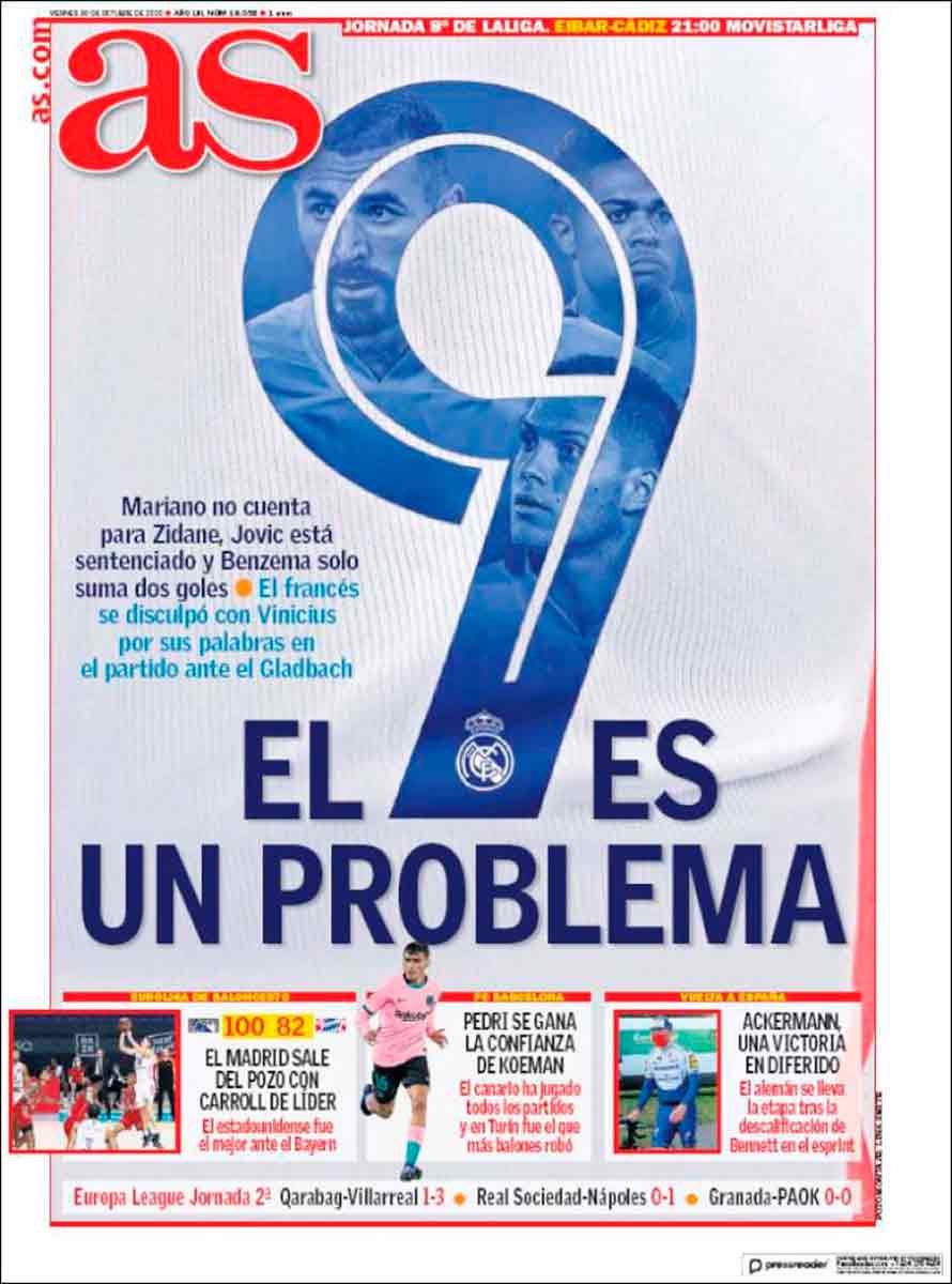 Cansados ya mentalmente, después de darle vueltas al rebautizo de Tegueste (en adelante le llamaremos así, haciendo gala de la magnanimidad con el adversario que caracteriza al madridista), lo de As no nos pilla del mejor humor. Sabemos que lo de As va de esto, es decir, de magnificar los problemas del Madrid vía piperío agotador, o de inventarlos donde no los hay si hace falta. En este caso sí hay un problema con el 9, al no ser esta la posición mejor cubierta en el equipo, pero qué queréis que os digamos, es ya una cuestión de aguante. Ahí fuera la pandemia arrasa con nuestras logísticas, nuestras economías y hasta con las vidas de seres queridos; los políticos se quedan a años luz de los niveles de eficiencia y ejemplaridad mínimamente exigibles: en Francia el islamismo radical anda por ahí decapitando gente; y en medio de todo esto As quiere que suframos muchísimo porque "Mariano no cuenta" y "Jovic está sentenciado". Con todo el respeto, querido As, acude tranquilamente a tomar lo que estimes oportuno por donde el sol nunca brilla, que ya tenemos suficiente con lo que nos pasa como para asumir encima que pretendas meter al Madrid en el saco (o en tu caso el por saco) de nuestros padecimientos. Déjanos en paz, anda.
