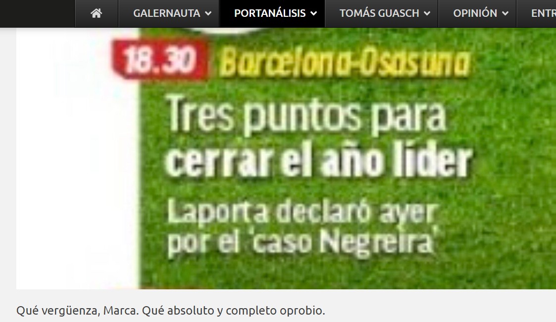 ¿Alguien espera algo del llamado “cuarto poder”, la prensa? ¿De verdad alguien creía que los medios subvencionados iban a presionar para que este escándalo se investigara o, al menos, para criticar como merecen a los organismos que debían velar por la limpieza de la competición y hacen una mísera e irrelevante pregunta al tipo que cuadruplicó los pagos al vicepresidente de los árbitros? El diario deportivo más leído, el poco gallardo Marca, se retrató el sábado pasado. Recordad el Portanálisis, en letra casi ilegible. Con la mitad de tamaño que la opinión de Juan del Val sobre Xabi Alonso. Esa es la importancia que le dan.