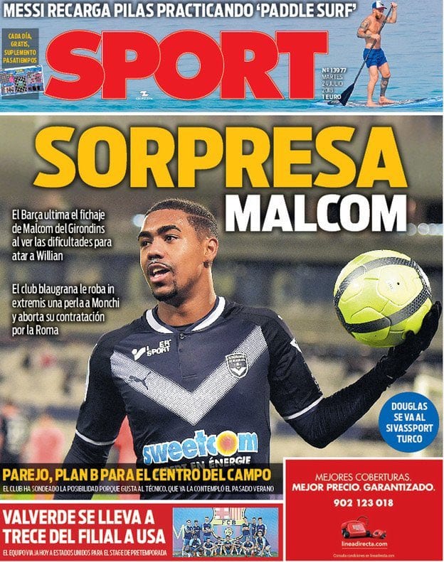 2. Pues sí. La palabra que utiliza MD, el Farsa "bloquea" el fichaje de Malcom, se habría convertido en algo bastante menos elegante de haber sido el Madrid. Hasta el sport se atreve a mencionar la palabra "robar", eso sí con la boca chica. Imagínense qué no habría sido de ser el Madrid.