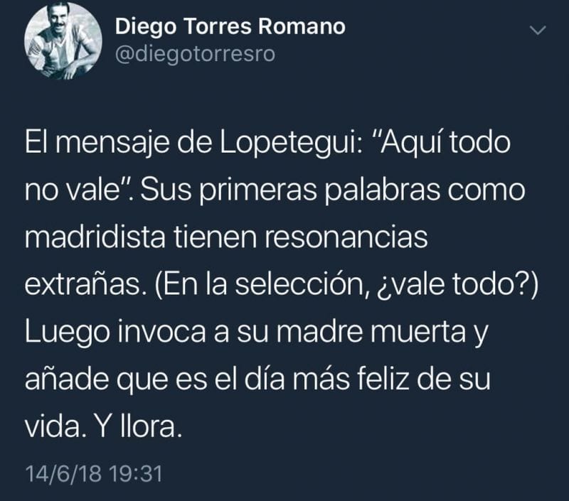 Pero en esta historia hay Cruz y cara, la necesaria (por ejemplo) para fabular con supuestas conversaciones de vestuario vikingo y cobrar por ello durante años. Y es que a Diego Torres, inefable escritor de ciencia ficción sobradamente conocido por su objetividad y viril renuencia a lo innecesario, tampoco le han gustado nada las lágrimas de Lopetegui. No querría enseñaros, pero llegado a este punto no tengo más remedio, el trino que Torres ha emitido, envuelto en bello esputo, sobre este particular.