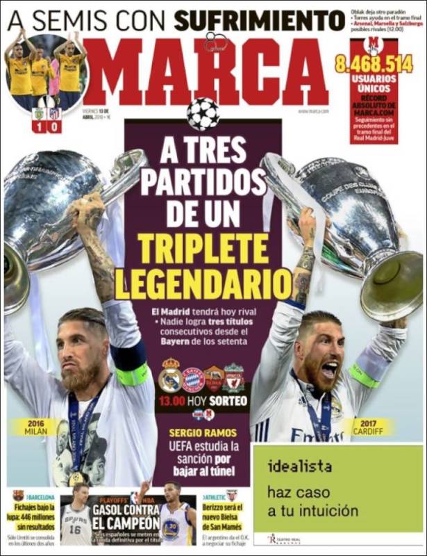 As y Marca, por su parte, han pasado página y ya tienen su vista puesta en las semifinales, cuyo sorteo es hoy a la una de la tarde y en cuyo bombo amenazan Bayern, Roma y Liverpool.