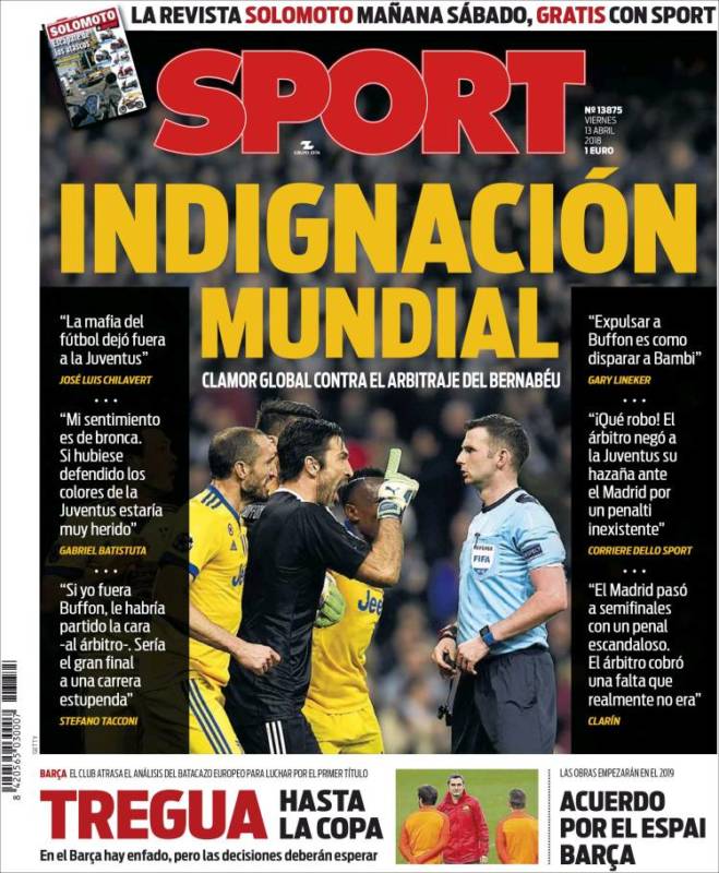 Ya lo veis, amigos. "Indignación mundial". Eso es lo que tú quisieras, Sport. Eso es mentira, Sport. La prensa internacional ha reconocido de forma muy mayoritaria la justicia indudable del penalti cobrado por Michael Oliver, pero Sport extiende la indignación hasta las antípodas, cubriendo la portada con su característico manto negro y perlándola de citas que son en sí mismas, también, constitutivas de delitos contra el honor del Real Madrid, desde la acusación de Chilavert -el único hombre sobre el planeta a quien los años, los kilos y la estulticia achinan progresivamente los ojos- hasta la declaración de Tacconi lamentando que Buffon no le "partiera la cara" al árbitro. Todo muy cívico en estas declaraciones que Sport hay que entender que hace suyas, como también hace suya la soplapollez mayestática de un gilipollas como Lineker (él llamó gilipollas a Pepe en dos ocasiones, así que no vemos por qué habría de contrariarle el uso del mismo epíteto para él), quien dice que expulsar a Buffon es como expulsar a Bambi, como si la reacción del portero italiano no hubiera sido más propia de La Matanza de Texas que de la factoría Disney.