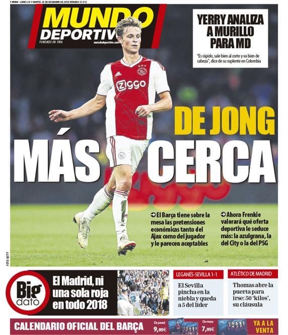 Pues, la verdad, la verdad, es que De Jong, está mucho más cerca del Madrid que de la farça. Tan cerca está que va a estar en el Bernabéu dentro de muy poco (jugando la eliminatoria de Champions contra el Real).