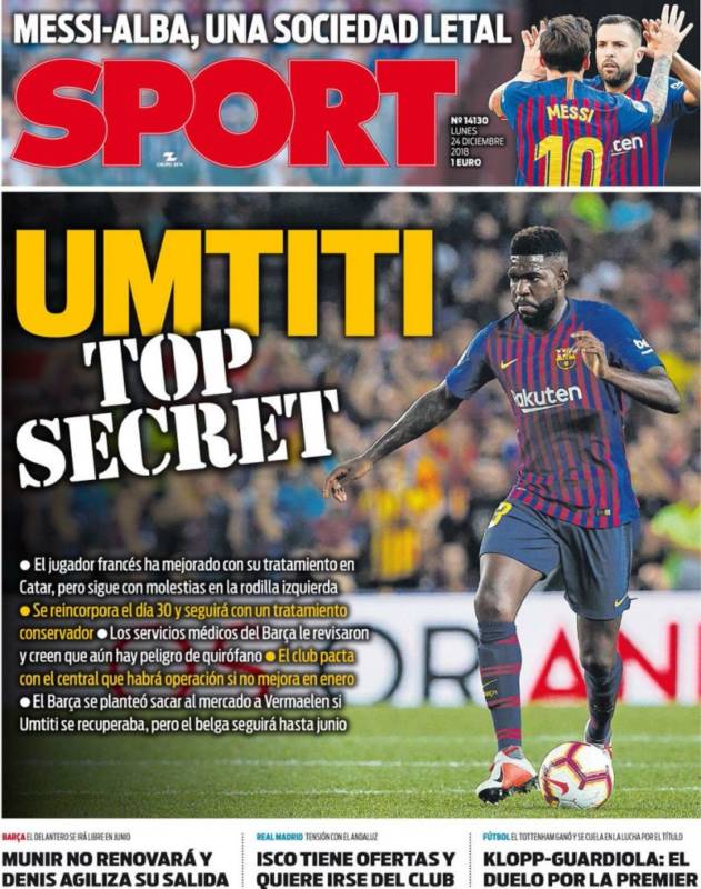 Sólo hay que ver las portadas de hoy para entender lo que decimos. Una vez superados los rescoldos de la final del Mundial de Clubes y la última jornada de Liga, lo suyo era analizar la situación del Atlético de Madrid y los motivos que lo han llevado a estar así. Pero no. 'La Ouija Today' nos felicita la Navidad, 'Marca' presume de madridismo después de más de 350 días mostrando todo lo contrario y la prensa cataculé se divide entre mercadillo y Umtiti.