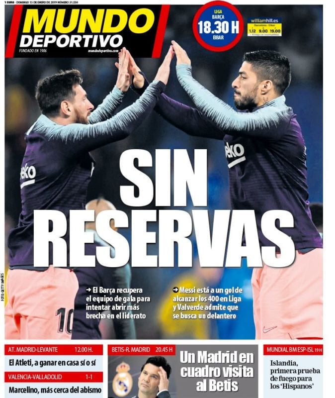 Me hace gracia la Portada de Mundo Sportivo,"sin reservas", obviamente visto lo visto en Copa frente al Levante los reservas no les valen. Así que tiene que volver a poner a Mordiscos Suárez y al hormonado más la sinpar ayuda del de amarillo y los del var.