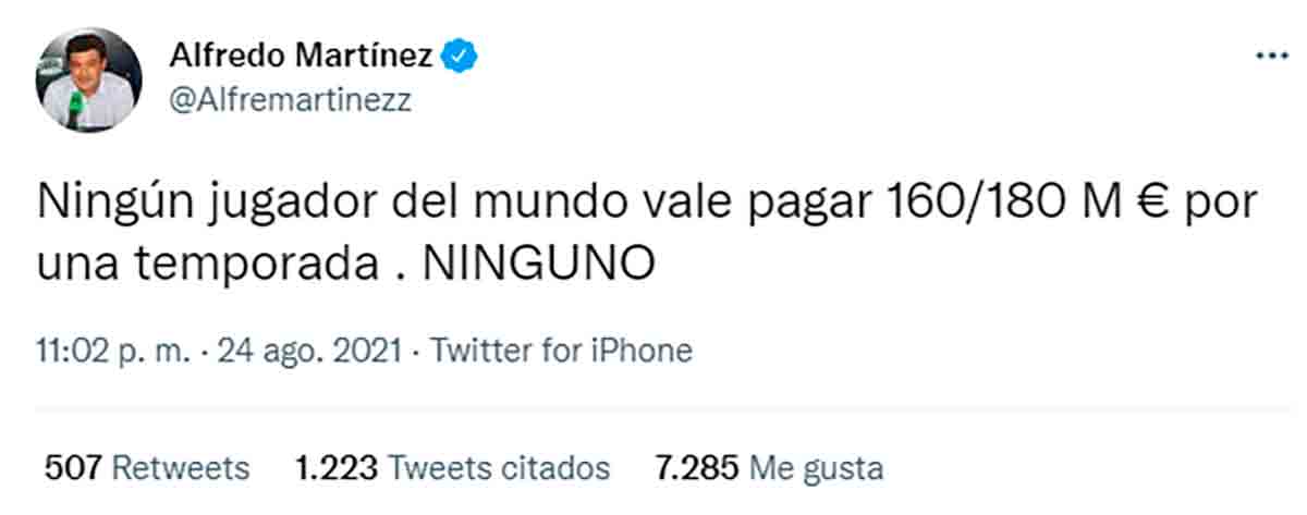 Alfredo Martinez, por si no le conocéis, es un culé furibundo que acosó vía Twitter a Carlos Tusquets, presidente de la Comisión Gestora del Barça, por atreverse a decir lo que ahora se revela trágicamente cierto: la dantesca situación financiera y patrimonial de la entidad catalana. Alfredo prefería que la mierda siguiera bajo la alfombra. Ahora pone el grito en el cielo y se pone todo digno porque se ofrecen 160 millones por Mbappé, o 180. Tranquilo, Alfredo, si tenemos que ofrecer más para que rabies de manera más entretenida, con más espumarajos y giros sobre la superficie del suelo, lo haremos sin dudar. 160 millones “por una temporada”, dice el tío. Acostumbrémonos a este mantra, que se va a repetir insaciablemente, desde las más variadas instancias, si el fichaje se consuma. Y si no se consuma también.