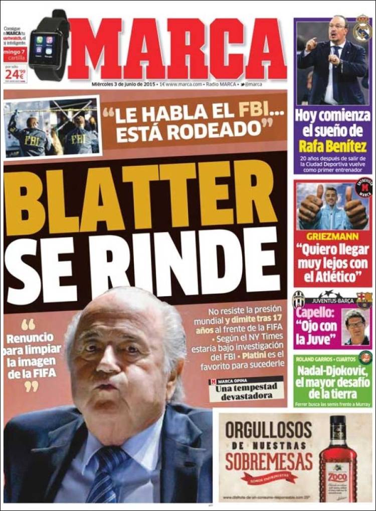 Los periódicos deportivos prestan hoy excesiva importancia a la fruslería de la dimisión de Blatter, acosado por el FBI, y ningunean sin embargo la magnitud de unas declaraciones de Fabio Capello que constituyen para el madridismo un auténtico asidero en medio de la tormenta.