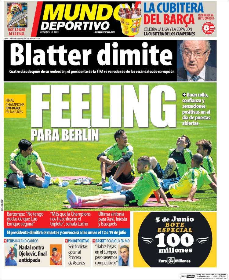 Una de cal y otra de arena en la portada de Mundo Deportivo. Acierta siguiendo nuestra recomendación de brindar un espacio menor al asunto Blatter pero, en lugar de darle cinco columnas a las declaraciones de Fabio (siendo fiel a la totalidad de nuestras instrucciones), nos sorprende con una gigantesca foto de varios jugadores del Barça rascándose las gónadas al sol. No era eso, Mundo Deportivo, no era eso.
