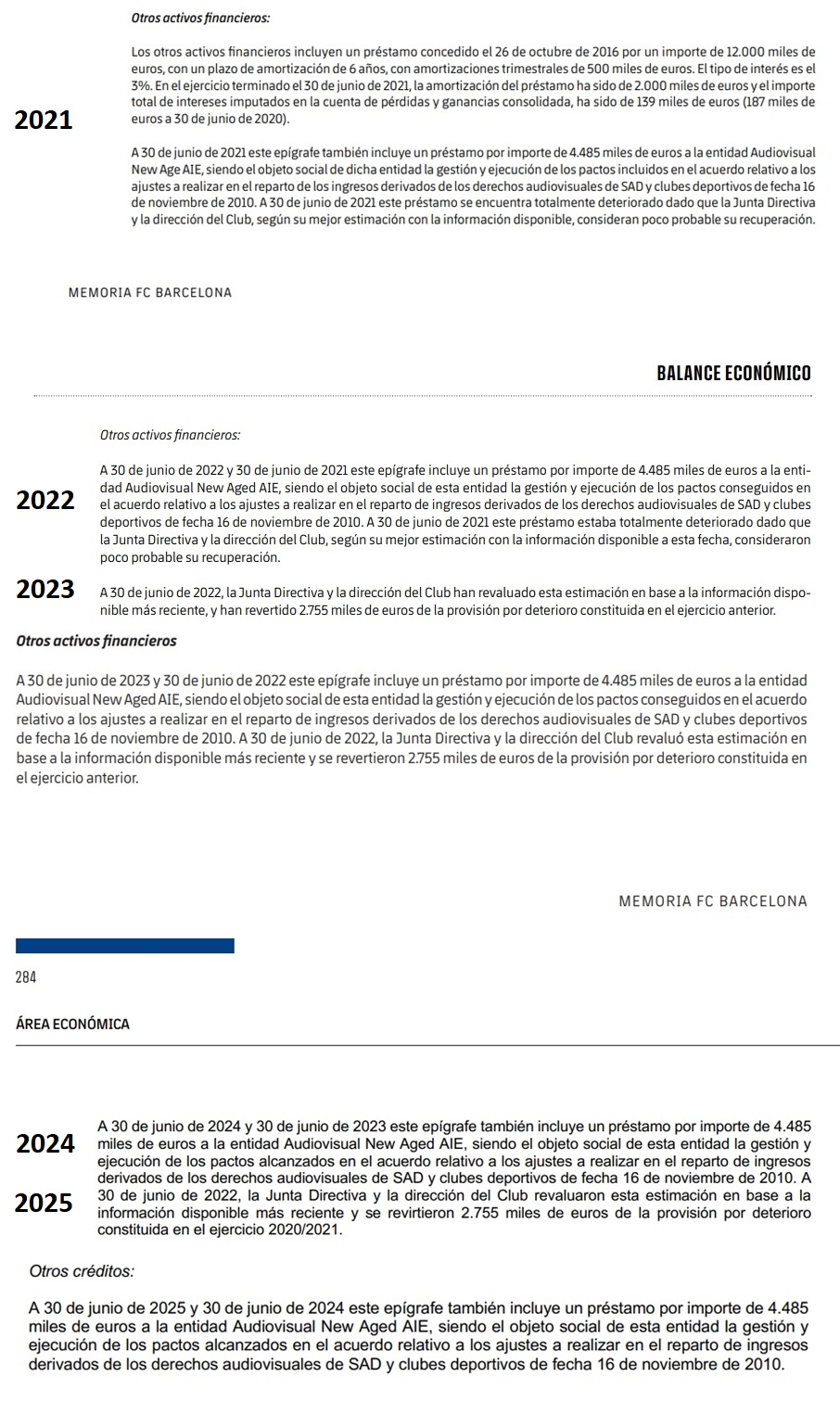 El préstamo del Fútbol Club Barcelona a Audiovisual New Aged AIE no figuró en las cuentas del equipo azulgrana hasta que Joan Laporta volvió al palco culé. Desde 2021, el préstamo no ha sufrido amortización alguna. En su ataque a Tomás Guasch, el presidente de La Liga confirmó que las actas de la inspección están recurridas judicialmente en la actualidad. Los contratos de los 34 clubes establecían que el importe a aportar podía aumentar si se disparaba la sanción. La transparencia de la que hacía bandera Miguel Cardenal no es tenida en cuenta por Tebas y sus secuaces, que mantienen silencio absoluto, más allá de burdas rectificaciones, sobre por qué los clubes asumen las sanciones de una entidad de la que nunca han sido socios, como sí lo son de otras del entramado empresarial de La Liga. En su última memoria económica, la correspondiente a la temporada 2024/2025, el Fútbol Club Barcelona establece que el objeto del préstamo es la ejecución de los acuerdos del G-35, sin especificar que se trata de la sanción de Hacienda que afectó directamente al bolsillo de Javier Tebas.