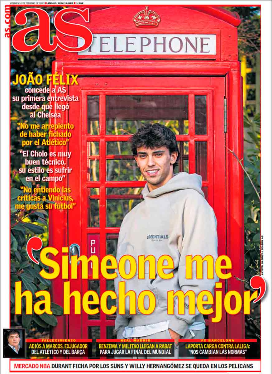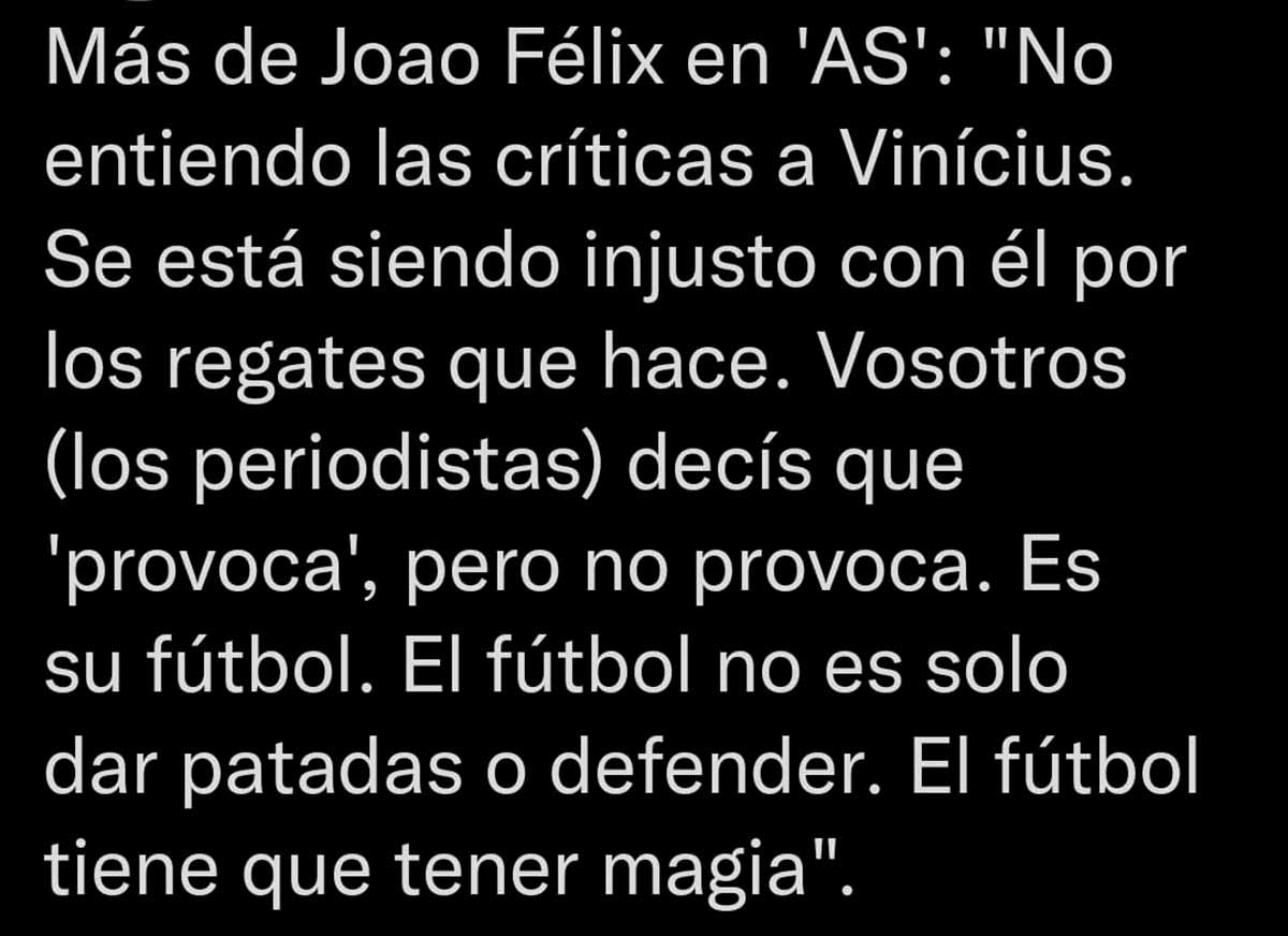 Buenos días, amigos. João Félix, jugador que aún está bajo contrato del Atlético de Madrid, ha derrumbado de un plumazo todo el ruin argumentario de los bullies de Vinicius. La refutación de toda la caspa antiVini, desnortada y en algunos casos manifiestamente racista, está hoy a la vista en la portada de As. Solo cabe elogiar la valentía del joven jugador, cedido en el Chelsea, y que por lo tanto se supone tiene que volver al Atleti, con sus ultras, sus periodistas y sus periodistas ultras.