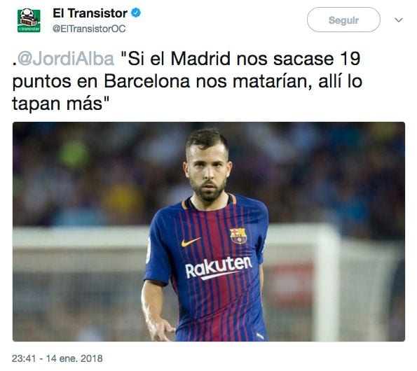 Debería saber Jordi Alba que al Real Madrid se le descuartiza hasta cuando gana. Es el único club del mundo que ha tenido que aguantar que tilden de "vergonzante" una victoria suya en una final de la Champions League. Evidentemente ahora se le atiza por mucho que Alba diga que no. Al que no critican en su ciudad vayan bien, mal o regular las cosas es al Barcelona, que tiene culés cubriendo su actualidad y antimadridistas cubriendo la del Real Madrid.