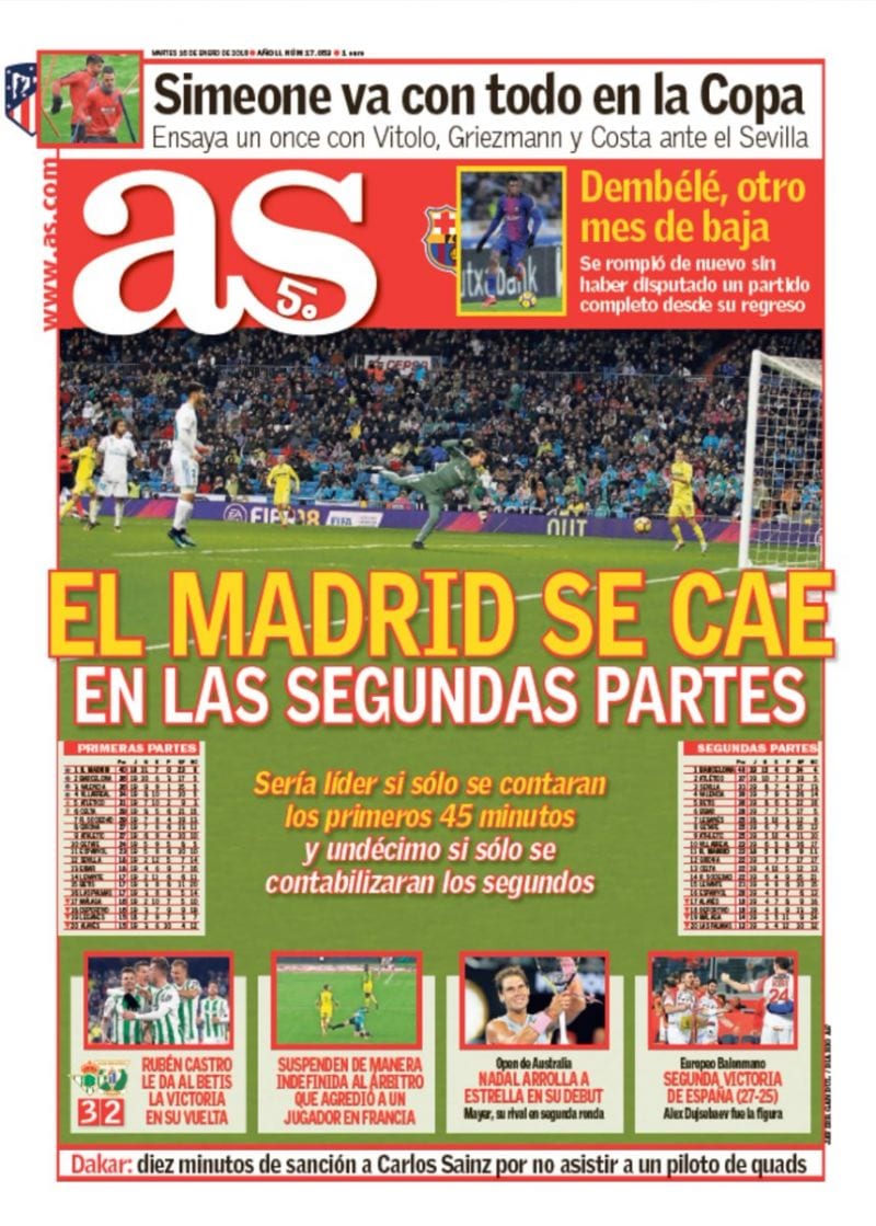 Ni siquiera tenemos la intención de hablar de esa caída que experimenta el Real Madrid en las segundas partes según muestra 'La Ouija Today'. Aunque debemos reconocer que es la primera vez que Relaño luce una portada con algo de "información" y no necesariamente para atacar al equipo merengue, sino para señalar el que puede ser uno de los problemas de la mala marcha del campeón de Europa. Mañana volverá la guadaña, estamos convencidos.