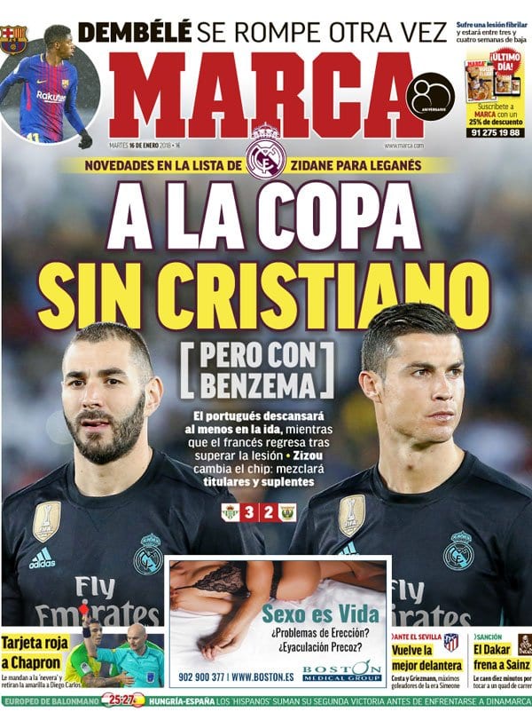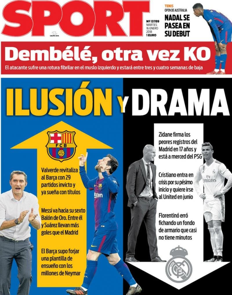 Buenos días. Os imaginamos expectantes por ver qué decimos sobre la portada de 'Sport' -la misma de siempre pero con otro tono y otras palabras- o de 'Mundo Deportivo', pero vamos a pasar por encima de ambas. No por nada, sino porque es un discurso manido, rescatado por el antimadridismo dos o tres veces por temporada. El Real Madrid siempre está en crisis -sólo deja de estarlo cuando pisa Cibeles- y Cristiano Ronaldo siempre quiere irse -el Portanálisis de ayer ya profundizó sobre el tema-. No hay una temporada en la que no se soben ambas teorías hasta el extremo. Da igual que estemos a 19 puntos del Barcelona que liderando la clasificación con autoridad.