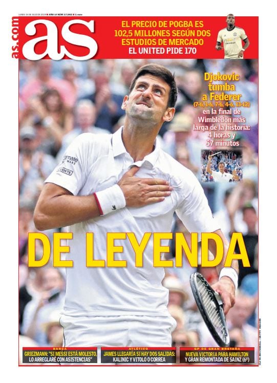 Buenos días. Cuatro horas y cincuenta y siete minutos. A Djokovic y Federer les costó más tiempo dilucidar quién era el nuevo campeón de Wimbledon que al Barça reunir el dinero de la cláusula de Griezmann. Bueno, más no, pero casi.