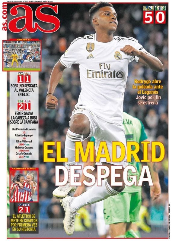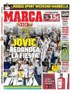 Por su parte, Marca destaca a Jovic, que ingresó en los últimos minutos, le anularon un gol, marcó otro y estuvo a punto de anotar de nuevo en un rechace, en las postrimerías del partido. Ya se estrenó, pues, el serbio, cuyo rictus amenazante se tornó sonrisa enternecedora en el vídeo que después le hizo Real Madrid TV. “Estoy muy contento. Hala Madrid”. Y nosotros por ti, Luka. Esta bestia parda de ademán imperturbable y trazas de asesino de película de espías nos va a dar muchas alegrías a poco que Zidane encuentre el modo de hacerlo compatible (ya sea tocando el esquema o rotando) con un Benzema que atraviesa el mejor momento de su carrera.