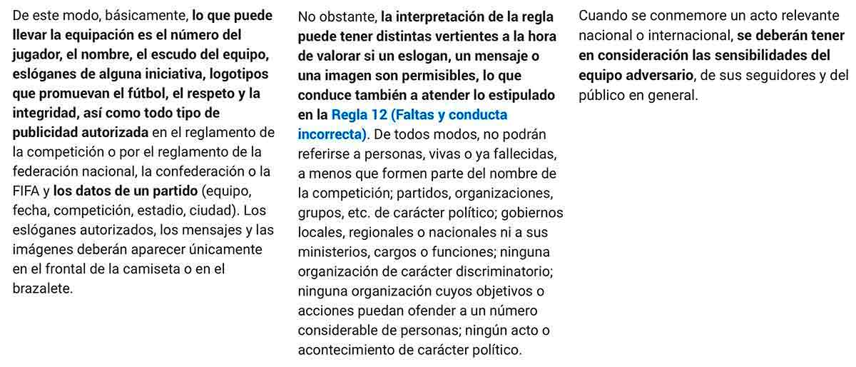 La norma estipula que lo que puede llevar la equipación de un equipo de fútbol es el nombre del jugador, el número, eslóganes de alguna iniciativa, logotipos que promuevan el fútbol, el respeto, publicidad autorizada y los datos de un partido, como fecha, ciudad, estadio, equipo, torneo, etc. Estas imágenes pueden ir en el frontal de la camiseta o en el brazalete. Pero los eslóganes no pueden referirse a partidos, gobiernos o cargos políticos, a organizaciones de carácter discriminatorio, a ninguna agrupación cuyos objetivos o acciones puedan ofender a un número considerable de gente, ni tampoco —lo importante en este caso— a personas vivas o ya fallecidas, a no ser que formen parte del nombre de la competición.