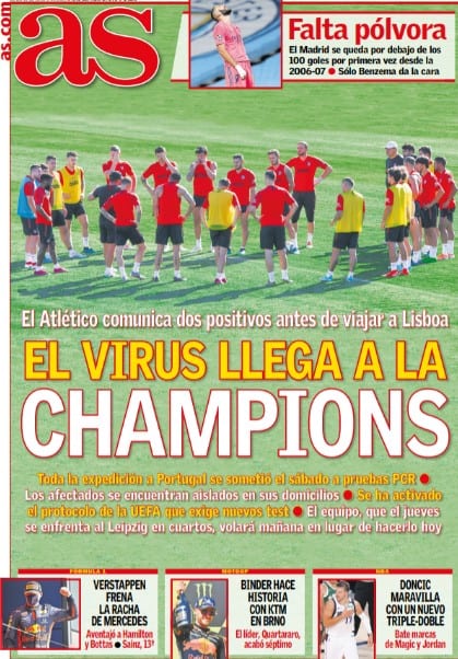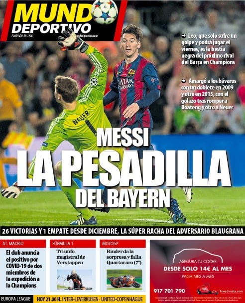 Si os parece que Sport dedica poco espacio al brote de Covid en la expedición atlética, mirad el espacio que le dedica Mundo Deportivo. Más que mirad, escudriñad, y buena suerte. Es un recuadrito irrisorio como parte de un faldón ofensivo. Todo el espacio es para el historial de Messi frente al Bayern, un historial que cuidadosamente omite el pequeño detalle de cierto 0-3 + 4-0 en el que Messi no quiso. Porque cuando Messi quiere ya se sabe. Ojalá el Bayern les ponga mirando al Atlántico, y no lo decimos por nuestro confeso madridismo, sino en aras de dar un disgusto al editor que ha tenido la falta de humanidad de darle casi toda la portada a Messi y un espacio infinitesimal al Covid.