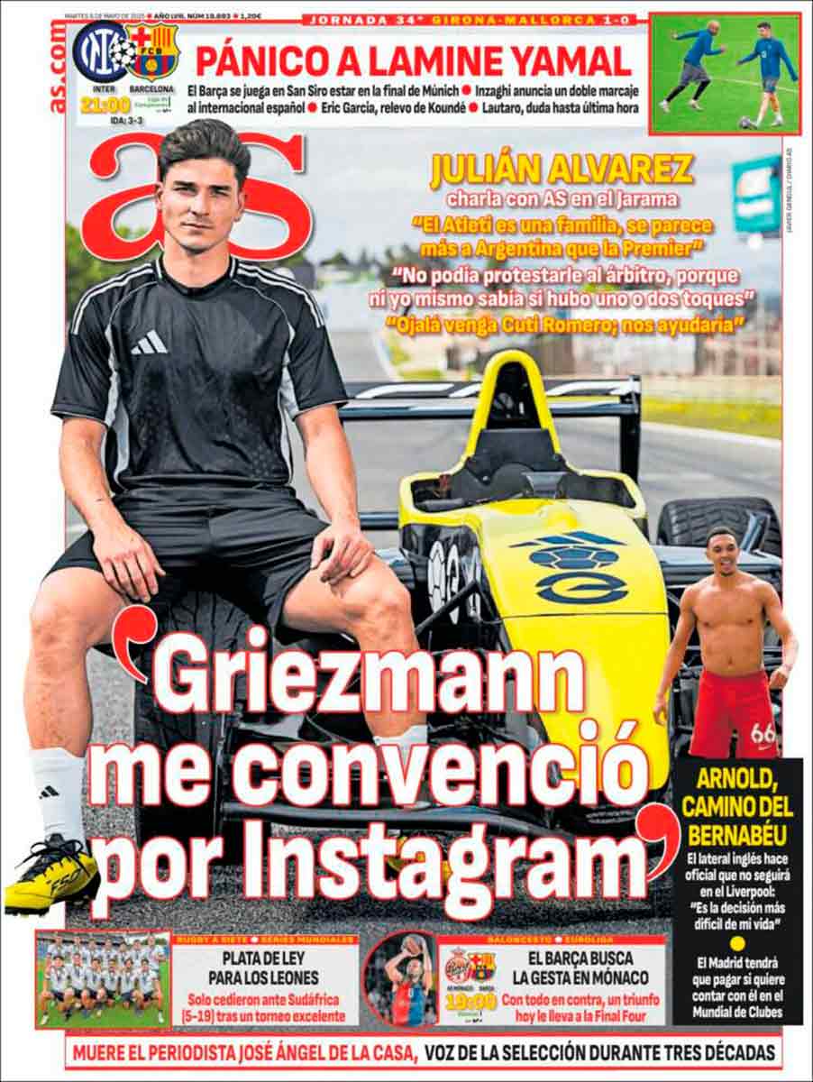 Ha fallecido la voz de los deportes en España durante tres décadas, Arnold ha anunciado que abandona el Liverpool —para recalar en el Madrid—, se juega la vuelta de las semifinales de Champions entre Inter y Barça y As elabora un frontispicio con Julián Álvarez apoyando las posaderas sobre el neumático de un coche de carreras en el circuito del Jarama y resaltando que Griezmann le mando un direct en IG. Bueno, cada cual tiene sus prioridades.