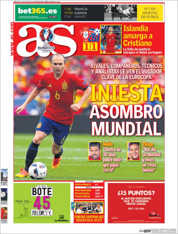 En esto andábamos esta mañana, capturing Iniestas, intentado sortear nativos de Fuentealbilla por las esquinas –también lo podrá encontrar en marquesinas de autobuses, anuncios bancarios, spots publicitarios y menús de cucuruchos- cuando hemos descubierto tras el fulgor de su calva dos noticias que comentar en la portada de The Hernia Chronicle. Como viene siendo habitual, la aportación informativa de Ouija Today se ha quedado anclada en algún viaje astral, como Hodor al portón de Juego de Tronos. "España juega al compás de Iniesta", afirma lírico Relaño desde su púlpito, del mismo modo que As publica al ritmo de su exacerbado antimadridismo florentino. Fíjense en cómo un Cristiano amargado por vikingos islandeses se ha colado en su primera plana. De los cuatro jinetes del Apocalipsis deportivo diario en los kioscos patrios, sólo Sport y As se ocupan de este asunto en portada.