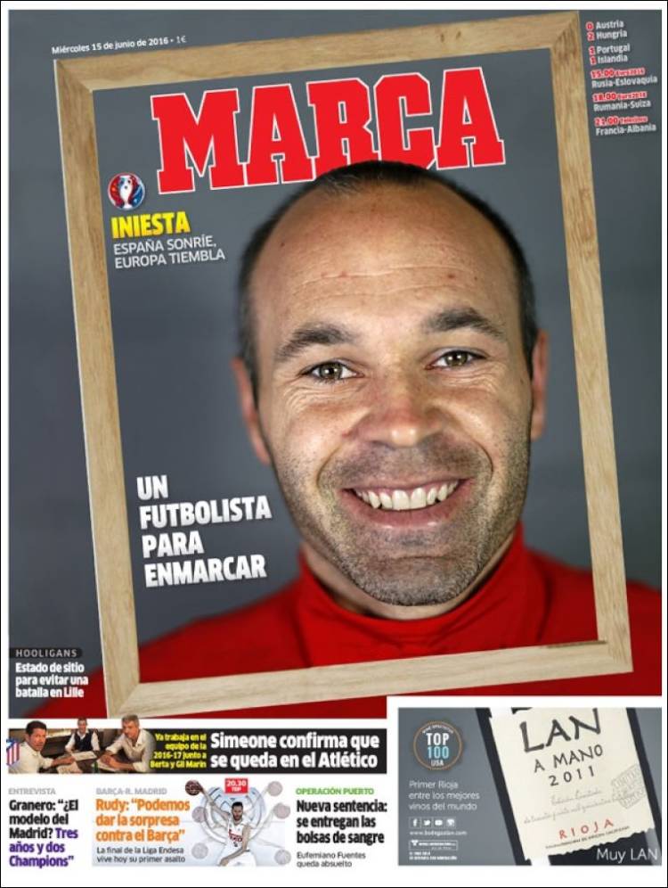 La prensa deportiva capitalina, zarandeada de nuevo por la simbiosis simbiótica del rinconcito, insiste cual Matías Prats demodé en empaquetarnos a Iniesta a toda costa. Todo sea en aras de la insoportable equidistancia de ese Diario del Deporte cuya bandera pretende enarbolar Marca, o sea por insuflar nuevos bríos a nuestro cariño menguante a La Roja que lidera Gerard Piqué, transmutado en Capitán Hispania de temporada. El caso es que este miércoles La Hernia nos ha enmarcado –sí, enmarcado, como lo oyen- al manchego pelón y La Ouija se he deshecho en elogios al de Albacete cual José Luis López haciendo reverencias ante el director general de turno. Kalise para todos. Y lluvia de trufopluses almendrados, que cuando juega La Roja, la bilis se torna almíbar; cuando juega la Roja, la Undécima se olvida... y cuando no, un poco también.