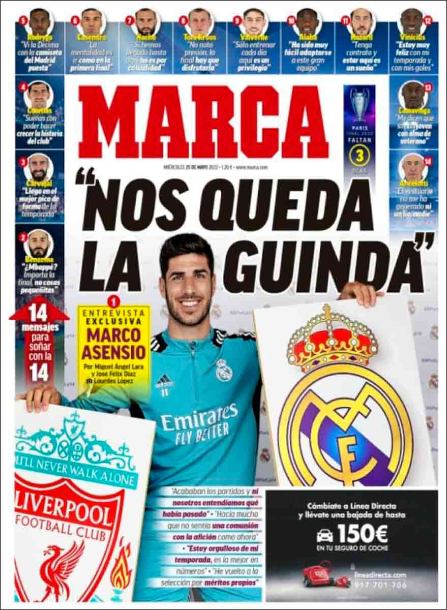 Marca rodea las palabras de Asensio con las de otros compañeros, desde la devoción por el escudo y su historia de un Courtois comprometidísimo al madridismo de cuna de Rodrygo, pasando por el deseo de reivindicarse de Hazard o la juventud hipermadura del prodigioso Camavinga. Todos a una en pos del logro más anhelado. Como indicábamos ayer, y considerando la trayectoria seguida por el equipo hasta la Final, esta puede ser la Champions más bonita.
