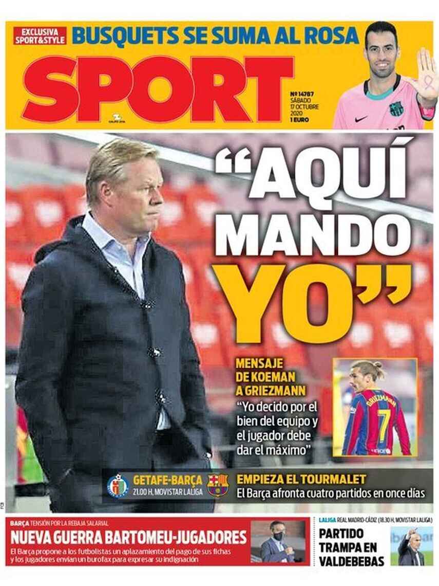 Lo mismo vienen a decirnos en Mundo Deportivo, que “MANDA EL TÉCNICO”. Sí, sí. Mucho mandar nos parece a nosotros y demasiado silencio al otro lado. Parece que al único al que pone firme el holandés es al pobre Antoine, aunque, por la imagen, más bien parece que Koeman ha visto algo que le inquieta en la parte baja del francés. Esperamos que no sea nada tan grande que pueda menoscabar su autoestima y como consecuencia su impresionante autoridad en el vestuario culé.
