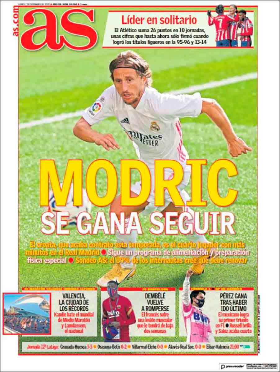 Ya que hemos mencionado a As, fijémonos en su portada de hoy. As es (suponemos) representante de aquella famosa Central Lechera cuya sátira ordeñó Guardiola, recibiendo a cambio de sus burlas la más servil veneración por parte de esta. Ya veis la afinidad con la institución. “Modric se gana seguir”. A la manera en que Marca acosó gentilmente a la entidad blanca hace unos días, con las ya célebres 100 razones para renovar a Ramos, hoy es As quien se permite poner al Real Madrid entre la espada y la pared en lo tocante a su política de renovaciones futuras. Hoy es Modric quien “se gana” renovar. Cabe preguntarse si lo que preocupa a As es el futuro de Modric o el crear una estado de opinión que incomode al Madrid y le fuerce a cambiar sus planes, por el mero hecho de hacérselos cambiar, por el mero afán de hostigar.