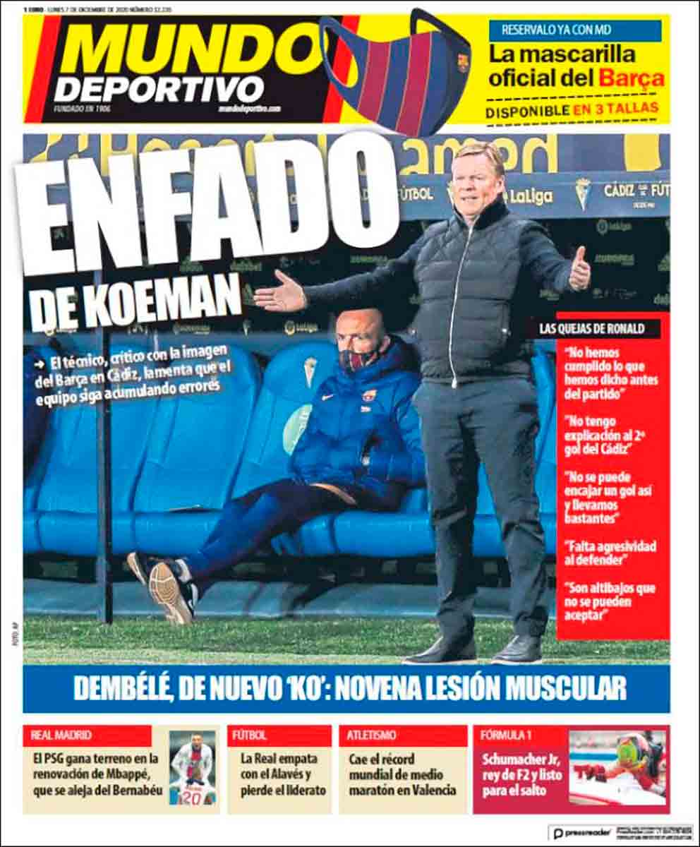 Buenos días. Tras su humillante derrota frente al Cádiz de Álvaro Cervera (gloriosa su refutación en rueda de prensa de la necesidad de la posesión, el gran mantra guardiolista y mediático), el FC Barcelona sufre la presión de las terminales mediáticas cercanas al club. El equipo está a tres puntos de los puestos de descenso y, como no podía ser de otro modo, la prensa se revuelve contra lo que está sucediendo, dando voz a una indignada afición culé. En particular, se acrecienta el acoso sobre Ronald Koeman, y ya se habla de que el próximo encuentro liguero ante el Levante será un match-ball. Pende sobre Koeman una espada de Damocles, un ultimátum que la prensa cataculé se ocupa de recordar día y noche en sus portadas, a la manera de lo que sucede con Zidane en el Real Madrid y su entorno.