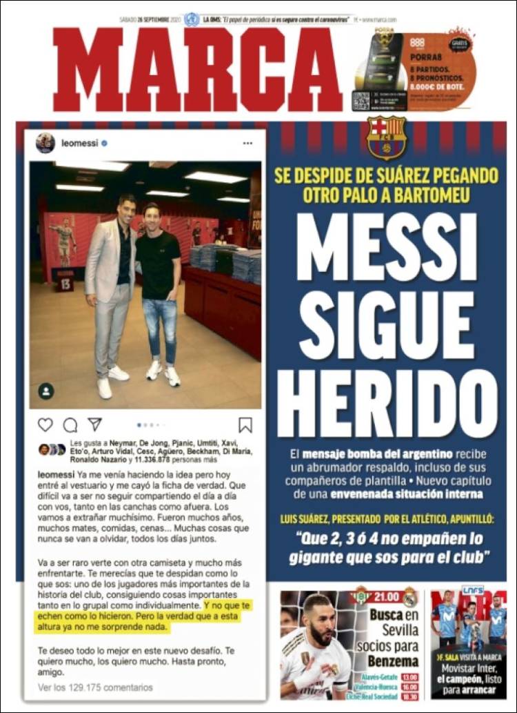 Nos despedimos con Marca, que le dedica su portada al Canto de Mí Mismo de Walt Messi Whitman, del que ya hablábamos aquí ayer en La Galerna. MESSI SIGUE HERIDO rima con "Messi ya se ha ido".