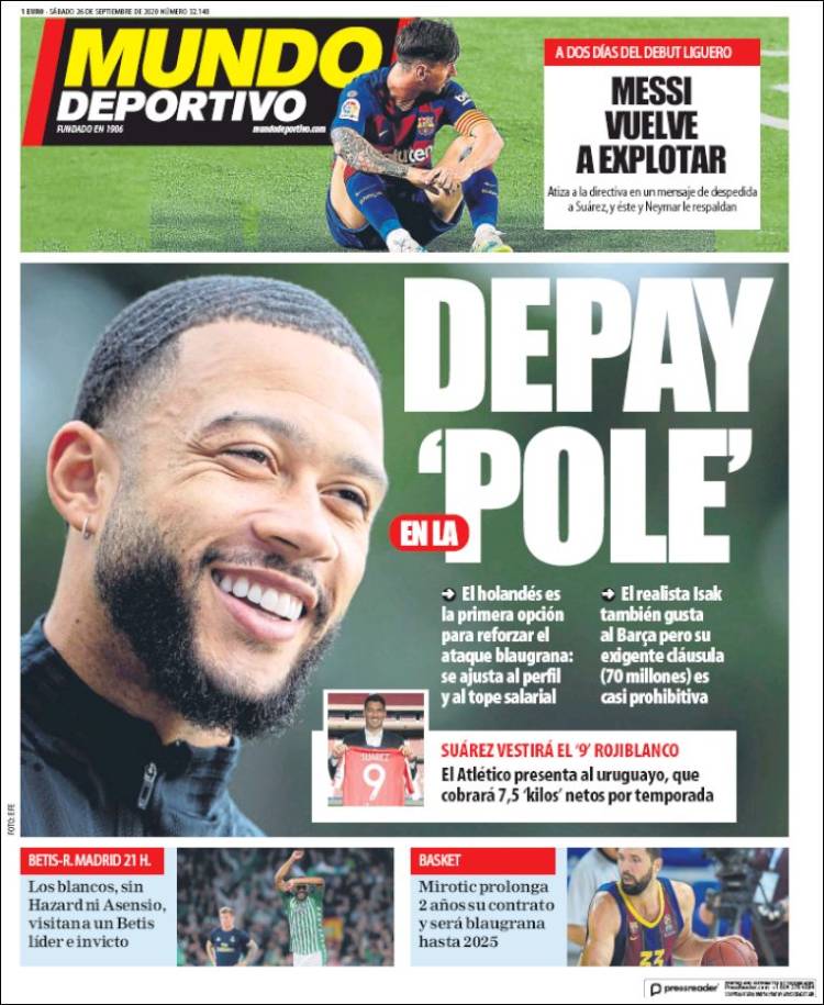 Buenos días. Estamos confusos. No sabemos quién es DEPAY ‘POLE’. Ah, perdón, que pone así en pequeñito, al lado de POLE, “EN LA”. Es DEPAY EN LA POLE. Así que hablan del Depay de toda la vida o del último mes, pues la vida de las portadas deportivas es como la de las moscas, que no dura más de veinticuatro horas. Por lo menos ya le hemos visto la cara a Depay en Mundo Deportivo. Porque algo que pasa a menudo es no saber qué cara tiene un jugador a pesar de que llevas oyendo años (como minutos) hablar de él y es como si le conocieras de toda la vida (de mosca). El aficionado culé ya debe de estar absolutamente familiarizado con el jugador holandés: