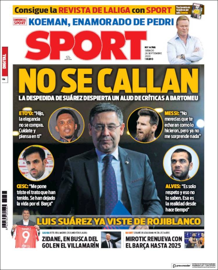 Ese sonido, ese lamento messiánico se reproduce en la portada de Sport, donde varios exjugadores azulgranas, además de Messi, parecen cantarle las cuarenta al oído de un Bartomeu con cara como de tener gases. Es una cara como de Jabba el Hut que en vez de a la princesa Leia tuviera encadenado al pobre Leo. Está como diciendo: “Pues ahora no respiro, ni veo y habla Cucho que no te escucho”. Esas palabras de los ex culés quieren hacer el efecto de un tormento íntimo. Pero Bartomeu no es precisamente Hamlet debatiéndose con sus demonios. A Bartomeu se la pela es la pela. Y si Bartomeu no es Hamlet, mirad por dónde que Koeman podría ser Romeo y Pedri Julieta. Sí, sí. Shakespeare en Sport.