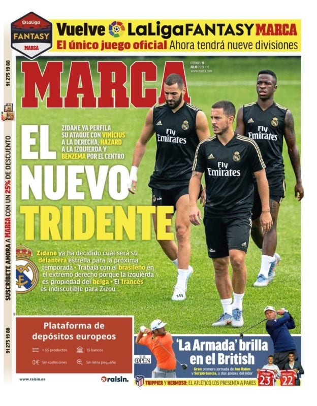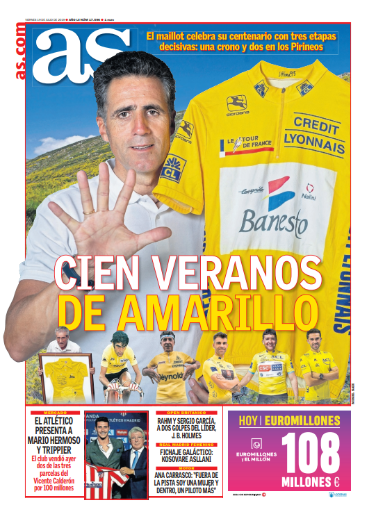 Centenario del maillot amarillo. nos informa As, comunicándonos un bostezo que por lo demás armoniza perfectamente con el recuerdo de tantas y tantas horas de siesta canicular en las sobremesas de julio de nuestras vidas, con el tour de fondo. La única noticia de la portada de As que nos interesa -desde nuestra óptica pura y confesamente madridista- ocupa un faldoncillo ridículo que nosotros ahora mismo, en la medida de lo posible, vamos a intentar paliar con una foto que no está en portada de ningún medio hoy, y ya nos extraña.