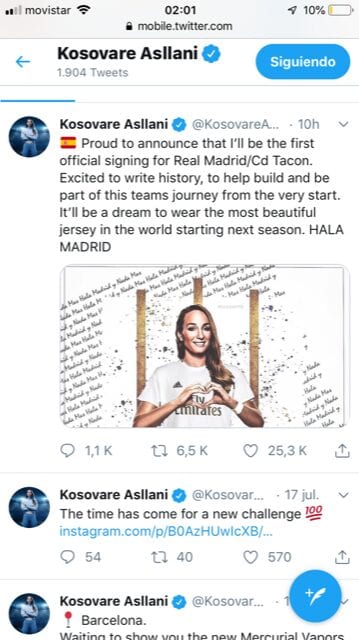 Sí, amigos. El CD Tacón, embrión inexorable ya del nuevo Real Madrid femenino, ha incorporado su primer fichaje. Se trata de una de las mejores atacantes del mundo, la sueca Kosovare Asllani, que en redes sociales ha mostrado su entusiasmo por entrar a formar parte desde el minuto cero de la mejor institución de mundo del fútbol a nivel global.