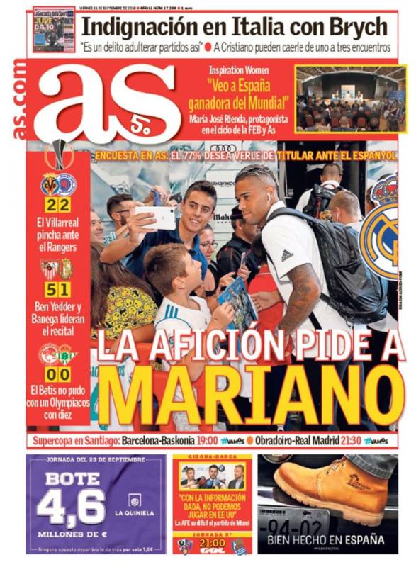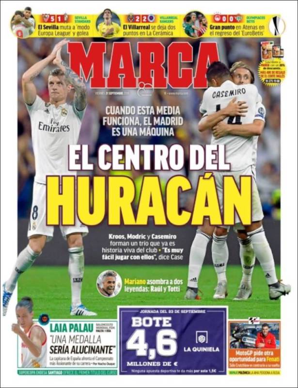 Por otra parte, el contraste de las portadas de As y Marca es significativo: el As se atribuye el papel de portavoz del madridismo, y pone el foco en Mariano, a quien pretende convertir en el nuevo sonajero con el que idiotizar a la afición (en detrimento, por supuesto, de otro jugador no español). El Marca, en cambio, da a su portada un enfoque más colectivo y, cómo decirlo, un poco menos presentista.