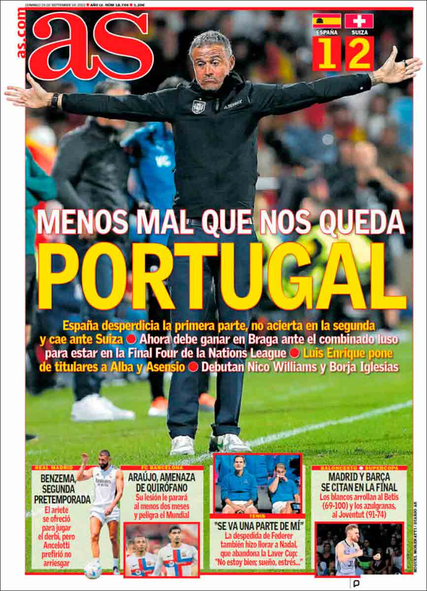 Por su parte, el diario As opta por una instantánea -como el café que necesitamos ayer para aguantar todo el partido- en la que Luis Enrique abre los brazos en aparente inmolación, que sin embargo no casa con su gesto de "oye, ¿qué más quiere que haga yo si ya he puesto a seis del Barça como titulares?". No parece entender lo que pasa nuestro seleccionador. Ha hecho lo indecible para que la cosa funcione y viene Suiza a Zaragoza y nos clava dos goles de córner mientras nuestro tiki-taka aburre hasta a las vacas de Setién y nuestras ocasiones de gol se cuentan con los dedos de la mano con la que, indefectiblemente, se tapa la cara Busquets cada vez que lo rozan.