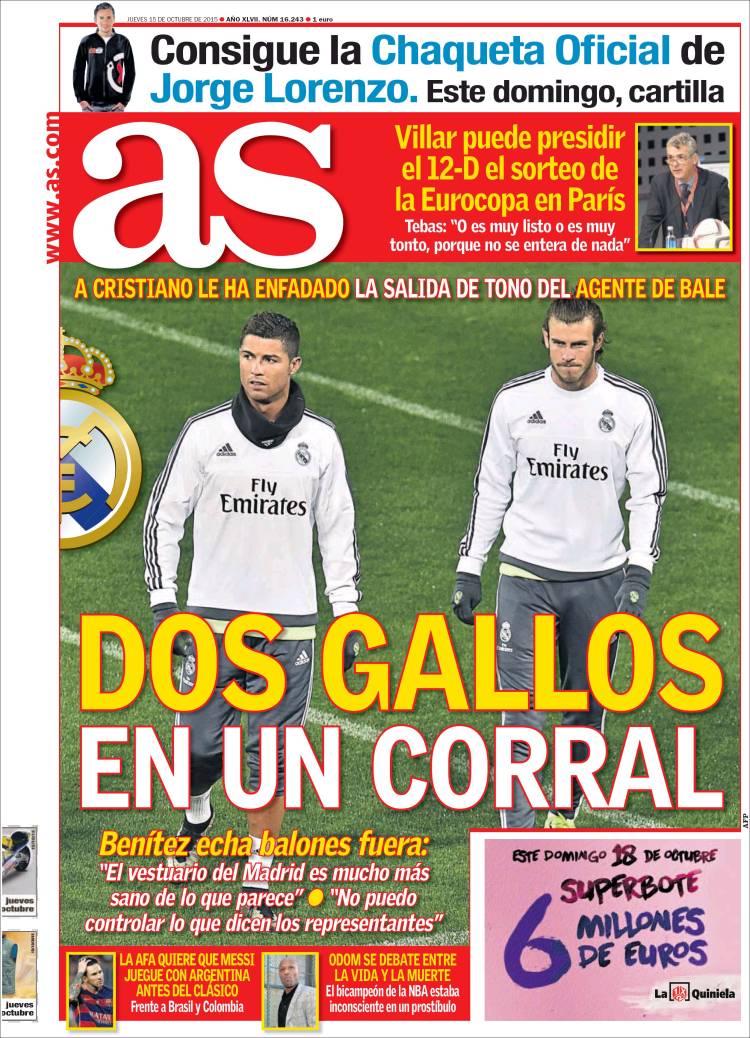 “Dos gallos en un corral” titula el diario de la Ouija sobre una anodina imagen de Cristiano y Bale en un entrenamiento. AS se aleja de la epopeya mitológica griega del portanálisis galernauta y prefiere -fiel al estilo Relaño- apostar por un titular más cercano a Félix María Samaniego. Tal es la fábula del diario de los chicos de Alfredo, donde también hay espacio para repartir una colleja al bueno de Rafa Benítez que por allí pasaba. Parece que el bueno de Rafa "echa balones fuera" (!!). “No puedo controlar lo que dicen los representantes” dice AS que Rafa dixit. Pobre Benítez. En apenas unos meses ha pasado de plegarse a los caprichos de Gareth, ofender a Cristiano, hincar rodilla ante Ronaldo y abroncar a Gareth a “no controlar lo que dicen los representantes”. Todo según As, claro. Esquizoide.