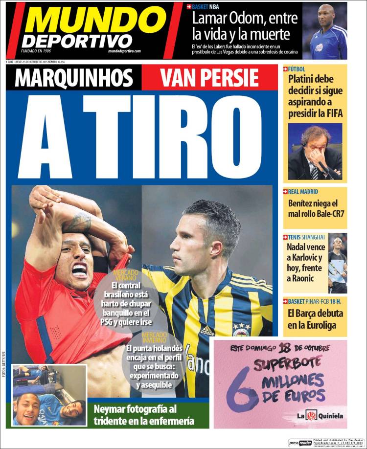 Lamentablemente para Sport, su colega Mundo Deportivo se encarga de verter un jarro de agua fría sobre su Confidencial de chichinabo. Cojan la lupa y busquen en la zona baja de su portada para descubrir la misma foto de la MSN bajo un lacónico “Neymar fotografía al tridente en la enfermería”. Nos preguntamos entonces… ¿dónde está el Sport Confidential ahora? ¿Nos vamos a quedar sin saber cómo se fraguó la amistad entre los Tres Sudamericanos? ¿Va a resultar finalmente que Sport ha desarrollado un folletín de Corín Tellado a partir de un selfie? Misterios todos ellos en cualquier caso mucho más interesantes que los posibles fichajes de Marquinhos y Van Persie por el Barcelona. Alguno de ellos, dicho sea de paso, lleva al menos una década fichando por el Barça.