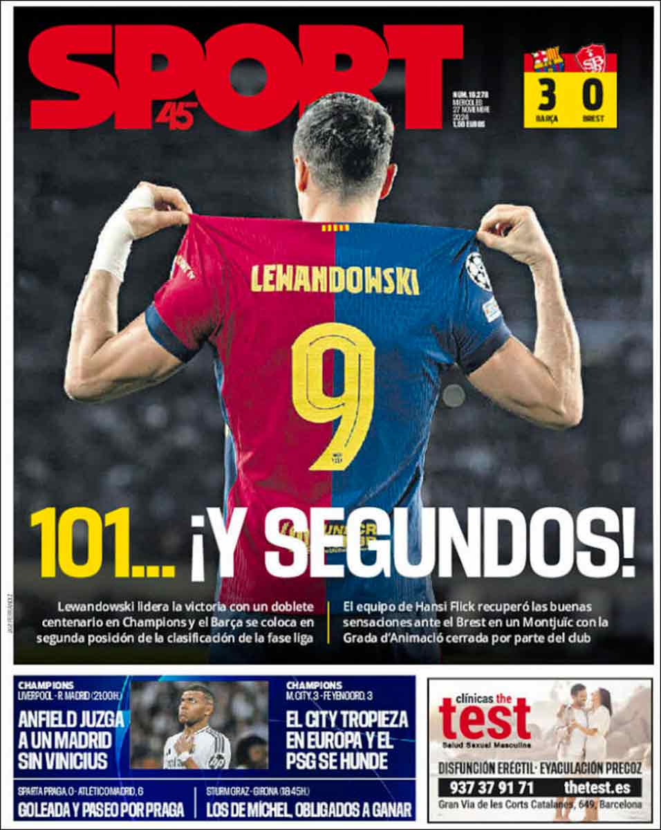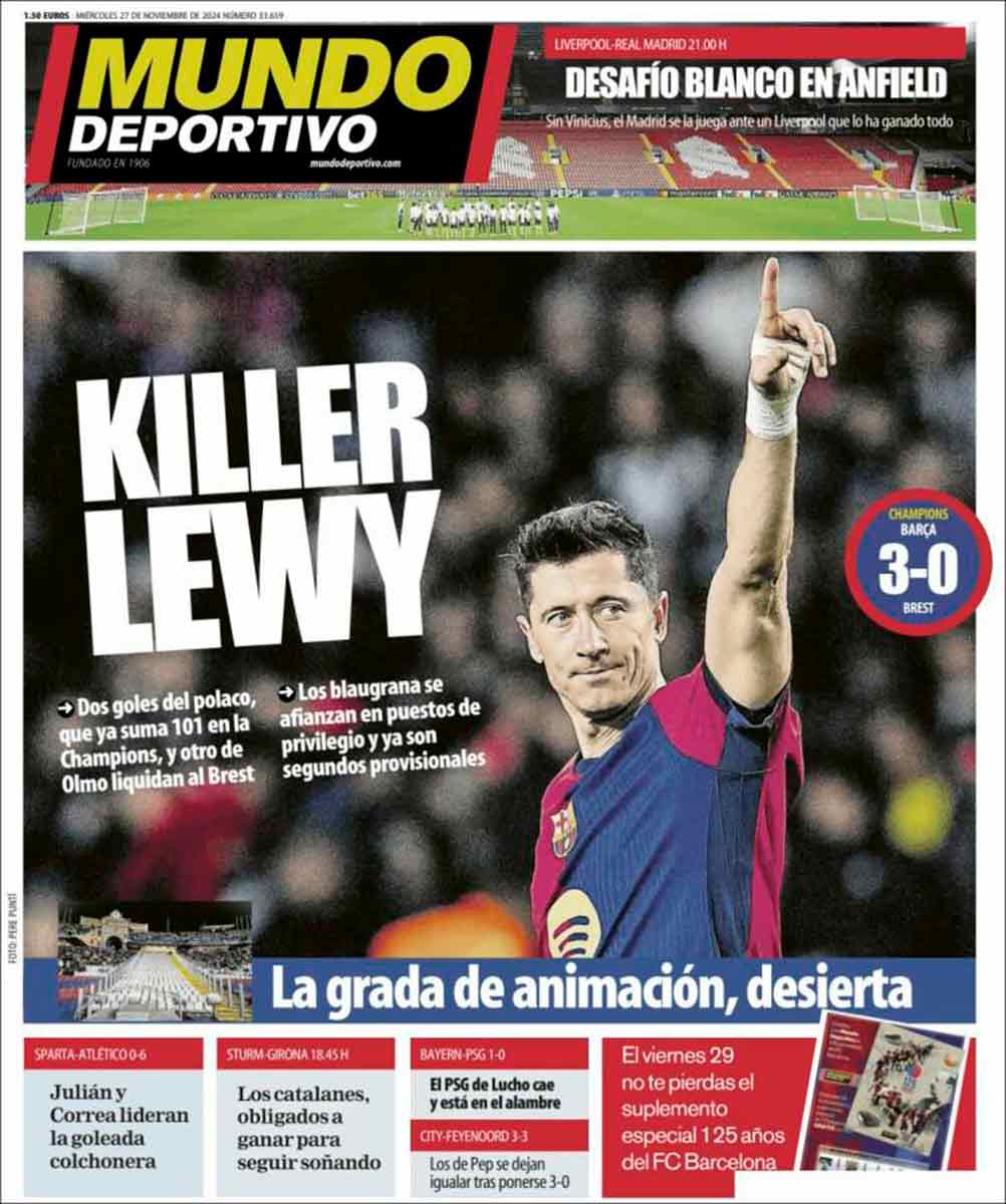 Así, las dos primeras planas de los diarios madrileños son para las huestes cholistas, mientras los clientes de Negreira, con Lewandowski a la cabeza, constituyen el argumento principal de la prensa cataculé.