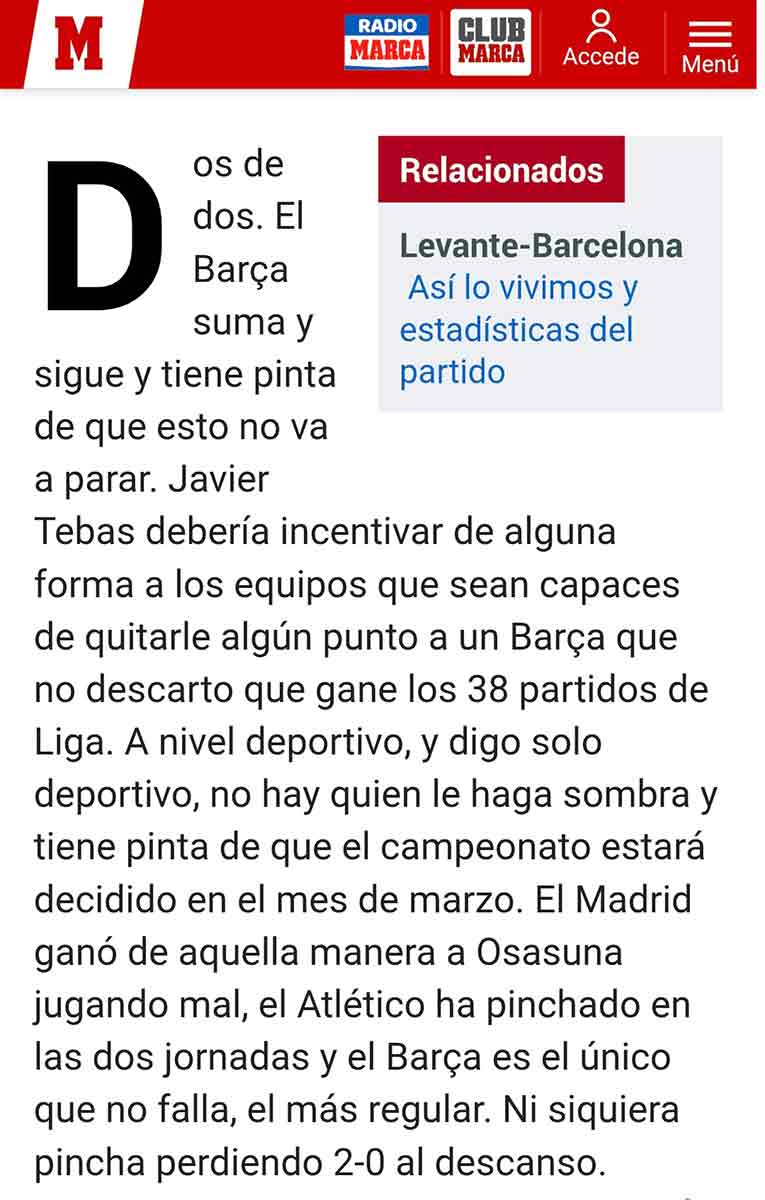 Creemos también que Tebas, además de incentivar de alguna forma a los equipos que sean capaces de quitarle algún punto al Barça, incentive de alguna manera a la prensa seria y veraz, a la prensa de la cual Marca es adalid.