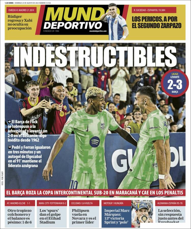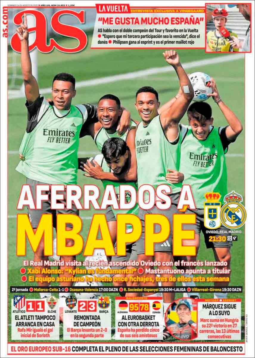 Porque el Madrid, no nos engañemos, ahora mismo solo cuenta con Mbappé, el resto de futbolistas son meras comparsas más propias de un club de 2ª RFEF. Y esta realidad debe quedar más clara en las portadas, sobre todo en la de un medio que quiera ser catalogado como Central Lechera pata negra. La primera plana de As, sin embargo, puede contener trazas —además de frutos secos, como cualquier cosa— de positividad al loar el estado de forma del francés. Muy mal. Estos días de desliz, As debe fijarse en Marca y seguir el ejemplo de Fernando Carnerero, quien probablemente habría titulado: «Mbappé, último asidero del Madrid para no descender», y habría desarrollado que tras un partido ganado «de aquella manera, tiene pinta de que no va a ganar más. Javier Tebas debería incentivar de alguna forma a los equipos que sean capaces de regalar algún punto al Madrid, que no descarto que pierda los 38 partidos de Liga».
