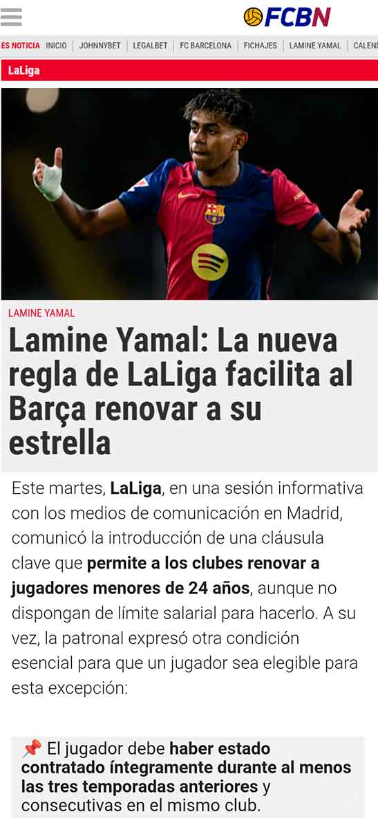 «LaLiga (...) comunicó la introducción de una cláusula clave que permite a los clubes renovar a los jugadores menores de 24 años, aunque no dispongan de límite salarial para hacerlo». Lo han expresado así porque habría llamado demasiado la atención haberlo plasmado como tenían pensado en un primer momento: «Los clubes establecidos en la capital de Cataluña que vistan a rayas verticales azul y grana y que se hayan comprado sin consecuencias el estamento arbitral durante al menos 17 años podrán inscribir, aunque no dispongan de hueco salarial, a futbolistas que se llamen Lamine, cuyo apellido comience por i griega y su padre haya sido hincha blanco hasta que su hijo comenzó a ganar pasta gansa en el Barça».