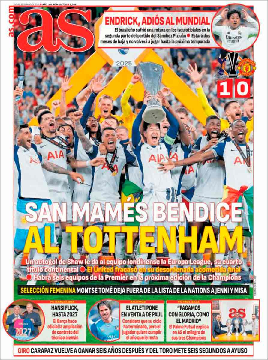 Del diario As, lo más destacado es la desgraciada lesión de Endrick. La rotura en los isquios que se produjo contra el Sevilla lo tendrá unos dos meses de baja, por lo que no podrá disputar el Mundial de Clubes.